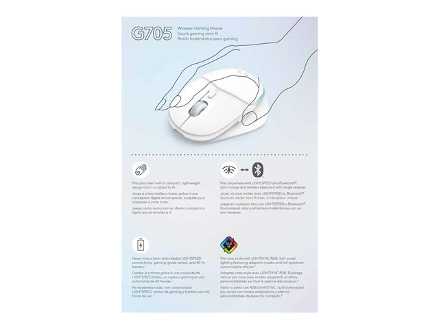 Logitech G G705 - Hiiri - pienet kädet - 6 painiketta - langaton - Bluetooth - USB Logitech LIGHTSPEED -vastaanotin - valkoinen 910-006367
